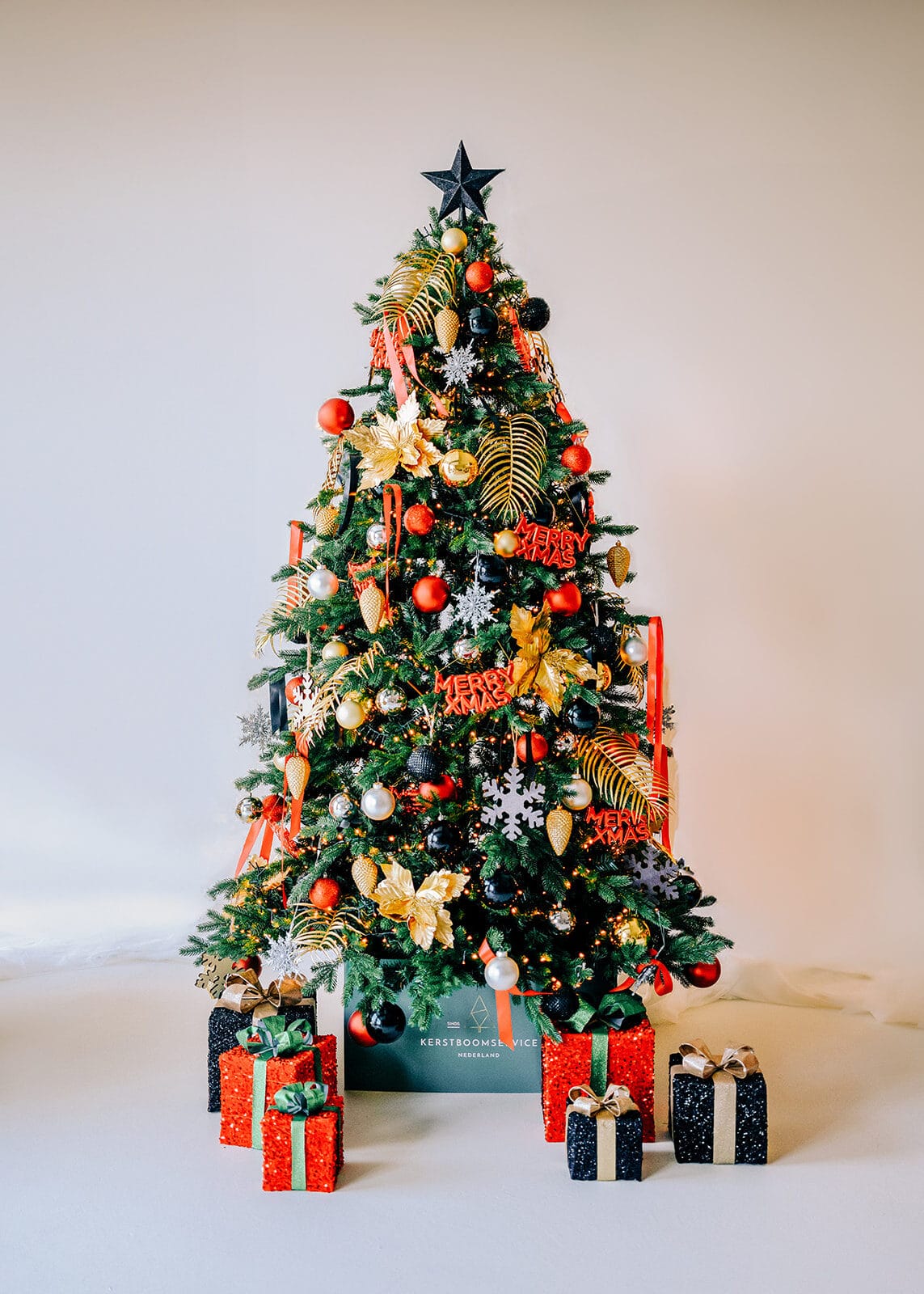 De meest explosieve boom die u ooit heeft gezien! vol met sprankelende ballen, gave hangers, linten en lichtjes. De boom heeft het allemaal! Een echte eyecatcher op uw locatie. Deze afbeeldingen bieden een impressie van wat u kunt verwachten. I.V.M. beschikbare voorraad kan het voorkomen dat enkele hangers verschillen van de afgebeelde foto. TIP: Vergeet je boom niet te upgraden met prachtige pakjes voor onder de boom. Die zijn los bij te bestellen voor 39,50 per setje van drie formaten pakjes, en maken het geheel nog meer af! Genoemde prijzen zijn huurprijzen inclusief op en afbouw door onze stylisten.